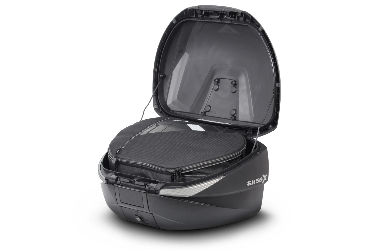 The eXpandible SH58X top case with Carbon finish and with adjustable volume in 3 positions (46-52 and 58 litres), has capacity to hold 2 enduro helmets without the need to put them on their side, plus travel accessories. The cutting-edge technology and the innovative design of the eXpandible case earned the prestigious Reddot Design Award 2017, a reference among designers and manufacturers. It is the only top case in the market that can be regulated up to 58L, and it is adapted both to everyday needs and to those adventure trips you have always dreamt of doing. It is a highly versatile top case, as changing between its different positions, it turns from an aerodynamic top case to a big case in just a few seconds. Its structural frame guarantees high rigidity and resistance with minimal weight and it also includes internal holding straps to ensure that the internal load does not move.