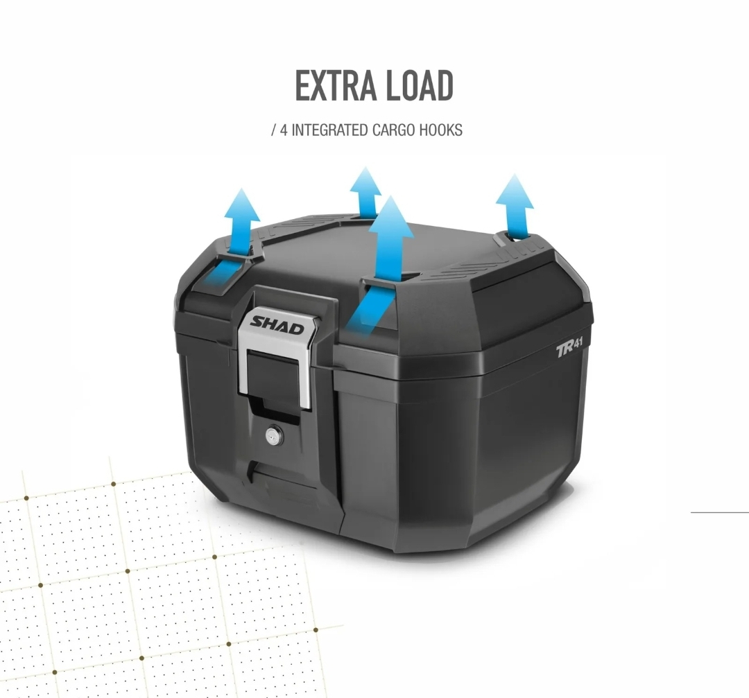 Cutia TERRA TR41 are o capacitate pentru două căști JET și până la 5 kg de încărcătură în interior. Fabricată din polipropilenă armată, oferă o rezistență superioară cu o greutate minimă. Proiectată 100% în Barcelona, are o structură concepută pentru a rezista. Rama sa etanșată protejează bagajul de ploaie sau praf. Include cârlige superioare pentru încărcătură suplimentară și o închidere din oțel inoxidabil care garantează securitate maximă. TR41 este o cutie versatilă, potrivită atât pentru șosea, cât și pentru off-road.