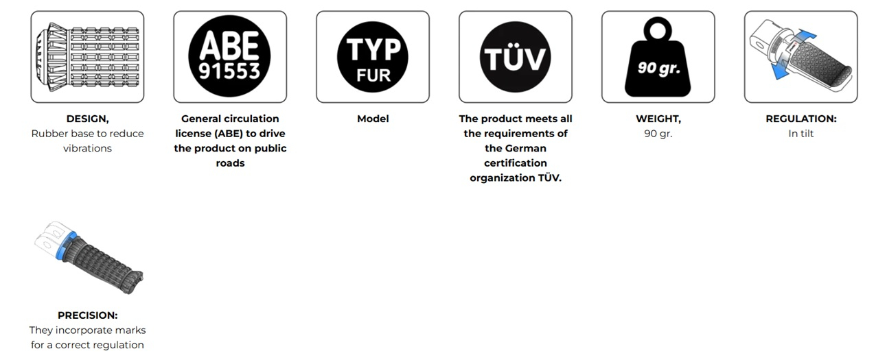 What distinguishes this footrest is its high quality rubber case, which reduces vibrations while maintaining maximum grip. Its light construction (weighs only 90 grams) and balanced dimensions (74.5 mm long and 26 mm in diameter) make the R-FIGHTER S an ideal complement for the biker who frequently performs a dynamic riding but does not want to give up certain levels of comfort during the route.