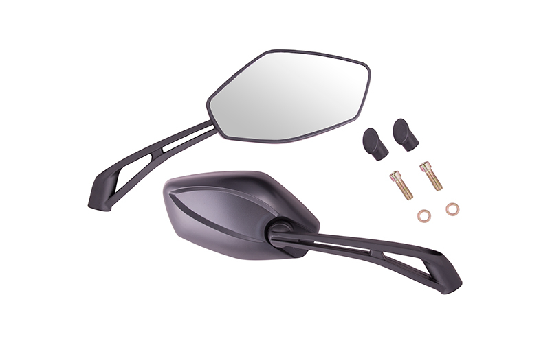 Oglinzi moderne, culoare negru mat, montate pe un suport durabil din aluminiu. Ele pot fi reglate intr-un singur plan. Dimensiunile oferă un camp vizual larg, ceea ce rezulta o siguranta mai mare. Setul include suruburi de montare cu diametrul de 8 mm si dopuri asortate.