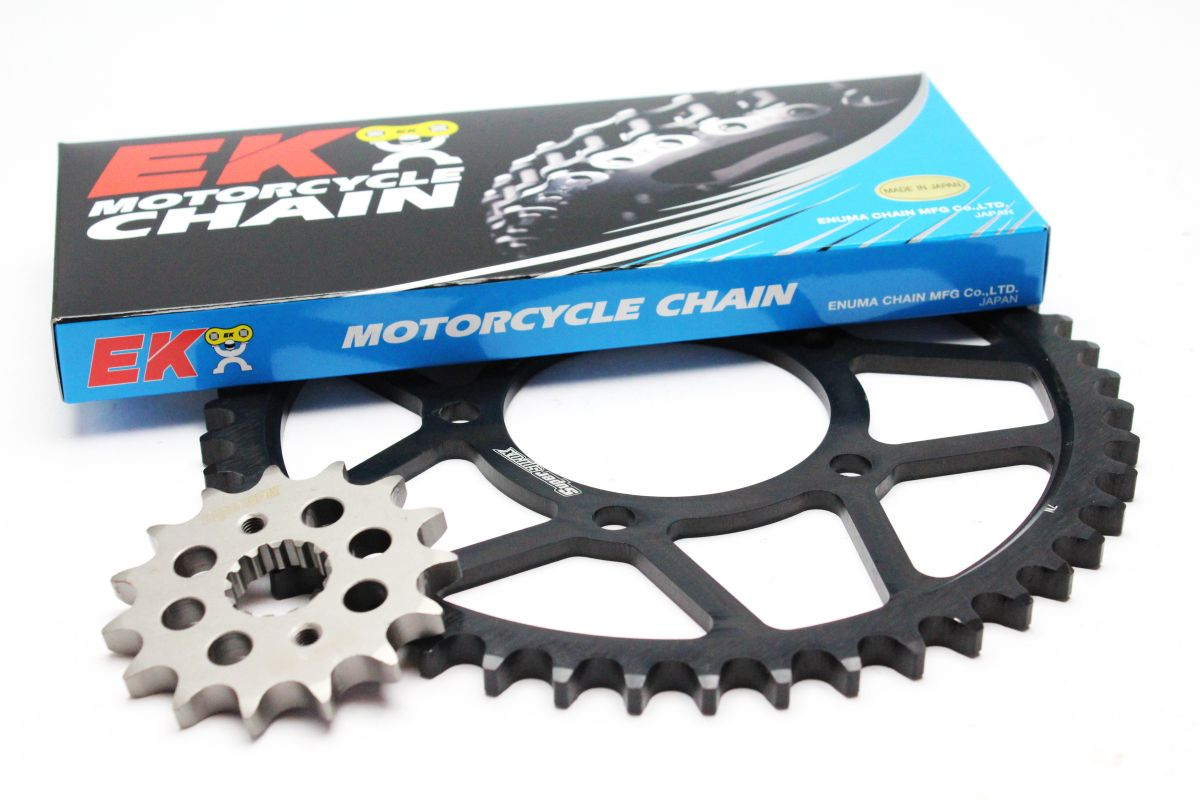 Chain kit - Chain EK, DEX serie, QX-ring chain. Steel front sprocket and rear sprocket SUPERSPROX.