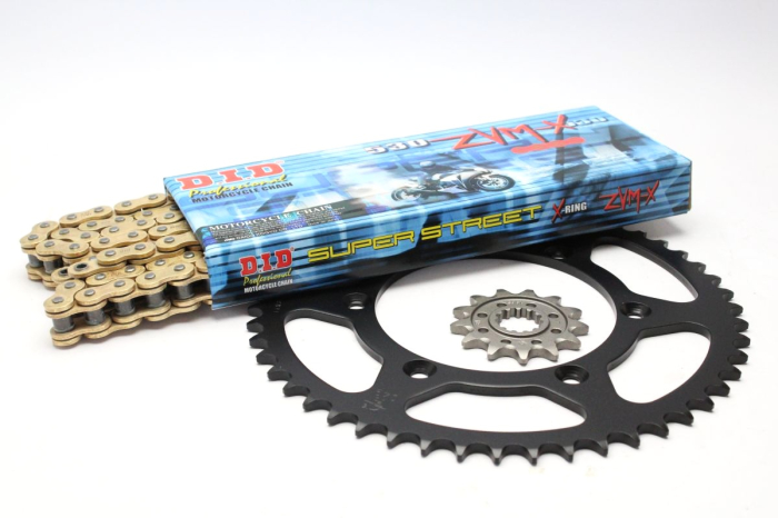 Chain kit - X-Ring chain D.I.D, ZVM-X serie in gold color. Steel front sprocket and rear sprocket JT.