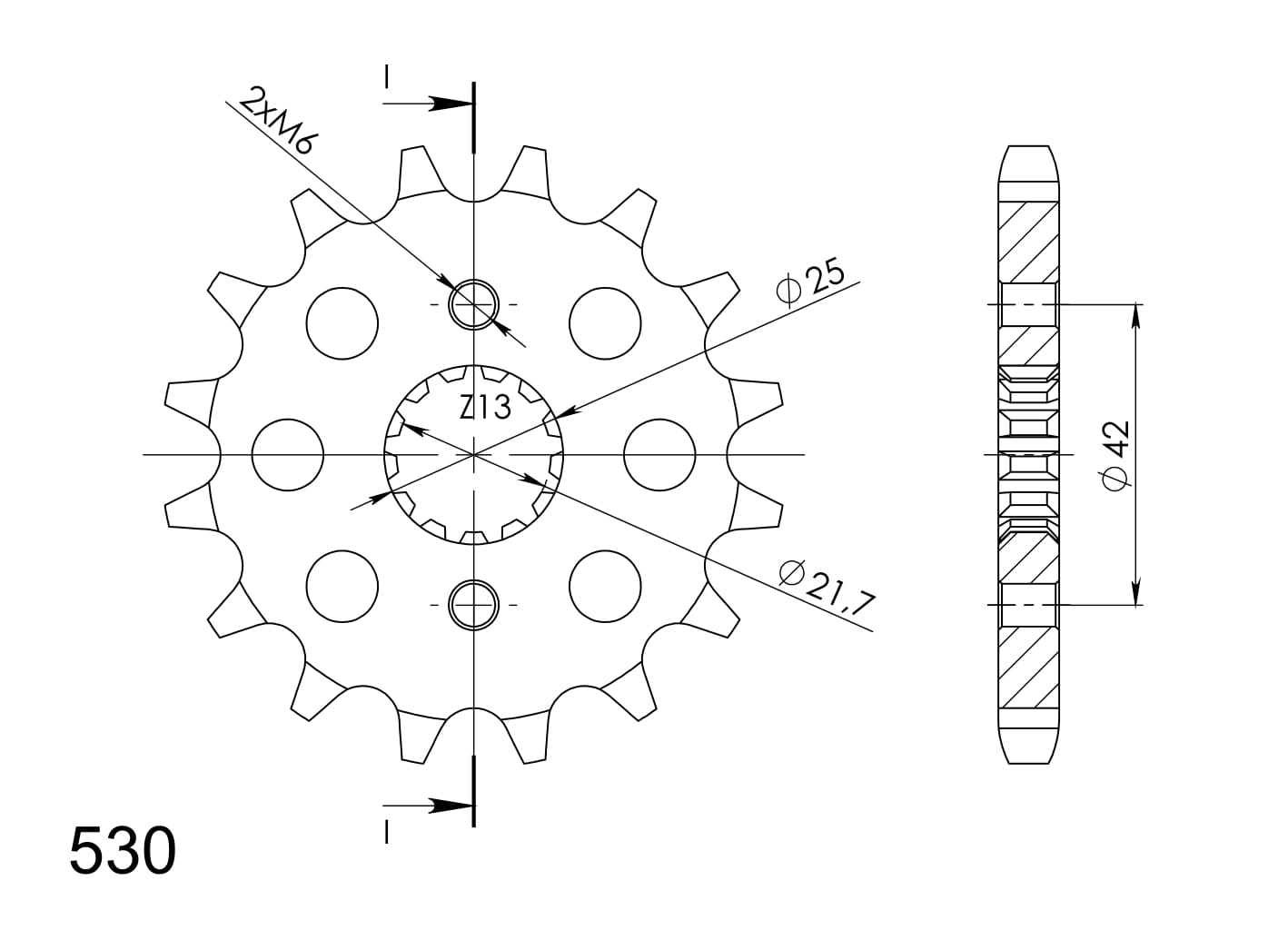 Every sprocket has weight reduction, with radial holes or radial slots (Forged models only) .