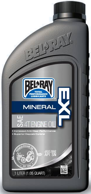Bel-Ray EXL Mineral 4T Engine Oil is a premium 4-stroke motorcycle oil. Meets the performance requirements of API SN and JASO MA2. Suitable for air-cooled/liquid-cooled 4-stroke engines and wet clutches.